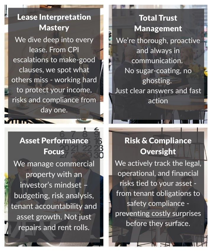 We specialise in commercial property management for landlords who want a proactive partner – not a passive manager. Our strength lies in the detail: lease clause interpretation, asset compliance, risk tracking, and performance optimisation.