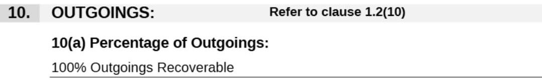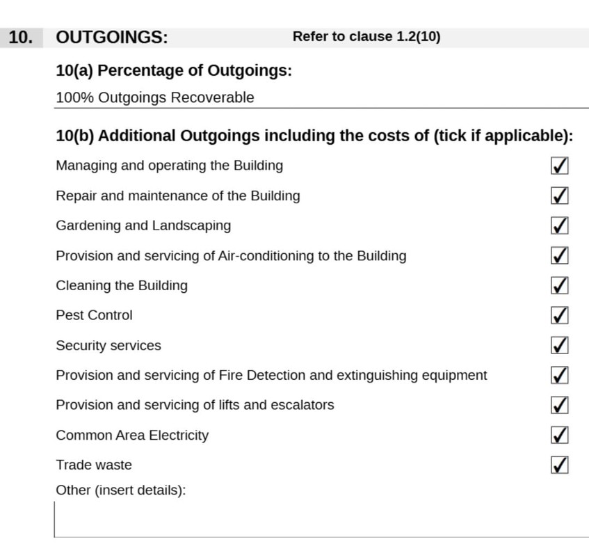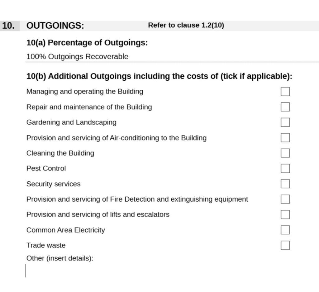 That means all you can recover is Rates etc, Insurance costs, Land Tax, Body Corporate and (here’s the kicker) the additional outgoings referred to in Item 10(b) (that’s those little checkboxes we’re about to chat about).